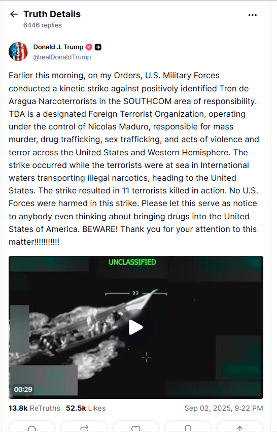 “The strike resulted in 11 terrorists killed in action. No U.S. Forces were harmed in this strike. Please let this serve as notice to anybody even thinking about bringing drugs into the United States of America. BEWARE!” Trump wrote, punctuating the statement with his trademark emphasis.