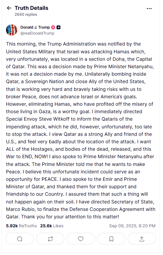 After the airstrike, Trump spoke with Prime Minister Benjamin Netanyahu directly. “He wants to make Peace,” Trump relayed. Trump also called the Emir and Prime Minister of Qatar to thank them for their support and assured them that “such a thing will not happen again on their soil.” Despite condemning the timing and location of the strike, Trump struck an optimistic note: “I believe this unfortunate incident could serve as an opportunity for PEACE.”