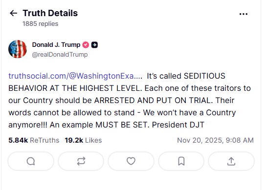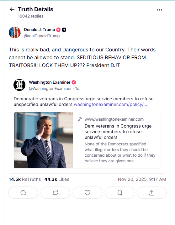 President Trump responded directly on Truth Social with a series of posts that escalated the public debate. He wrote that the group had engaged in “SEDITIOUS BEHAVIOR AT THE HIGHEST LEVEL,” adding that “Each one of these traitors to our Country should be ARRESTED AND PUT ON TRIAL.” In a follow-up post he warned, “This is really bad, and Dangerous to our Country. Their words cannot be allowed to stand. SEDITIOUS BEHAVIOR FROM TRAITORS!!! LOCK THEM UP??? President DJT.” He later added a third post stating, “SEDITIOUS BEHAVIOR, punishable by DEATH!” and even reposted a statement declaring, “HANG THEM GEORGE WASHINGTON WOULD !!” His language immediately prompted Democratic leaders to accuse him of calling for the execution of elected officials.